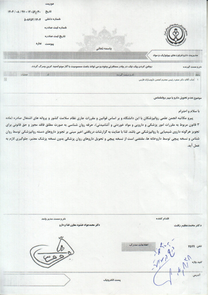 خانه>اطلاعیه های مهم>اطلاعیه دانشگاه علوم پزشکی شیراز در خصوص عدم تحویل دارو با مهر روانشناس اطلاعیه های مهمدانشگاه علوم پزشکی شیراز اطلاعیه دانشگاه علوم پزشکی شیراز در خصوص عدم تحویل دارو با مهر روانشناس علی رشیدی۲۸ آبان ۱۴۰۴ 42 کمتر از یک دقیقه واتس آپ اشتراک گذاری از طریق ایمیل چاپ علی رشیدی۲۸ آبان ۱۴۰۴ 42 کمتر از یک دقیقه واتس آپ اشتراک گذاری از طریق ایمیل چاپ
