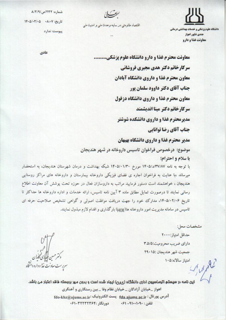 خانه>متفرقه>فراخوان تأسیس داروخانه در شهر هندیجان از توابع استان خوزستان متفرقه فراخوان تأسیس داروخانه در شهر هندیجان از توابع استان خوزستان علی رشیدی۶ اردیبهشت ۱۴۰۵ 8 کمتر از یک دقیقه واتس آپ اشتراک گذاری از طریق ایمیل چاپ علی رشیدی۶ اردیبهشت ۱۴۰۵ 8 کمتر از یک دقیقه واتس آپ اشتراک گذاری از طریق ایمیل چاپ