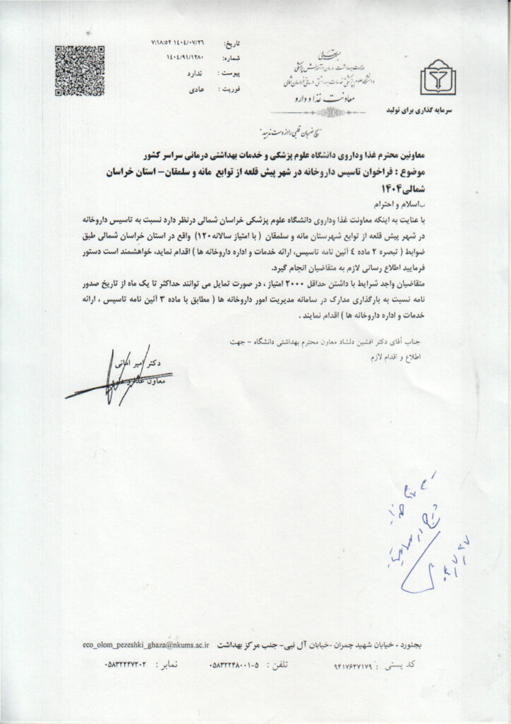 فراخوان تأسیس داروخانه در شهر پیش قلعه از توابع مانه و سلقمان استان خراسان شمالی