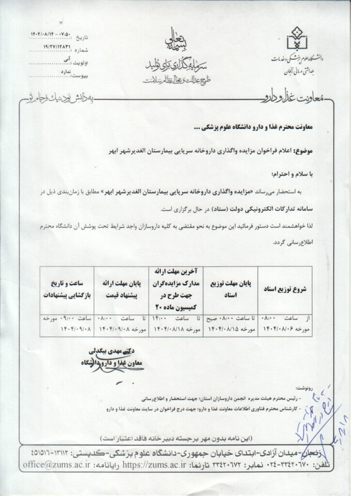 فراخوان مزایده واگذاری داروخانه سرپایی بیمارستان الغدیر شهر ابهر استان زنجان