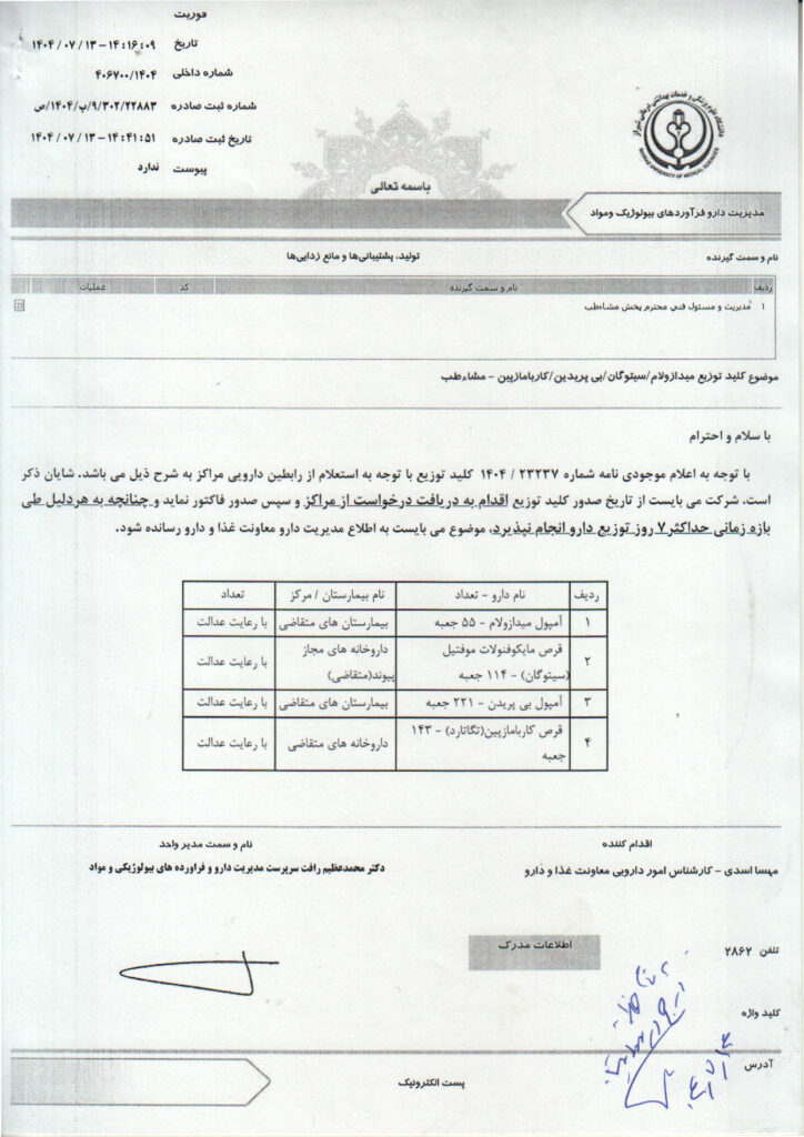 خانه>کلید توزیع دارو های کمیاب>کلید توزیع آمپول میدازولام، قرص مایکوفنولات موفتیل(سیتوگان)، آمپول بی پریدین و قرص کاربامازپین شرکت مشاء طب کلید توزیع دارو های کمیاب کلید توزیع آمپول میدازولام، قرص مایکوفنولات موفتیل(سیتوگان)، آمپول بی پریدین و قرص کاربامازپین شرکت مشاء طب علی رشیدی۱۴ مهر ۱۴۰۴ 7 کمتر از یک دقیقه واتس آپ اشتراک گذاری از طریق ایمیل چاپ علی رشیدی۱۴ مهر ۱۴۰۴ 7 کمتر از یک دقیقه واتس آپ اشتراک گذاری از طریق ایمیل چاپ