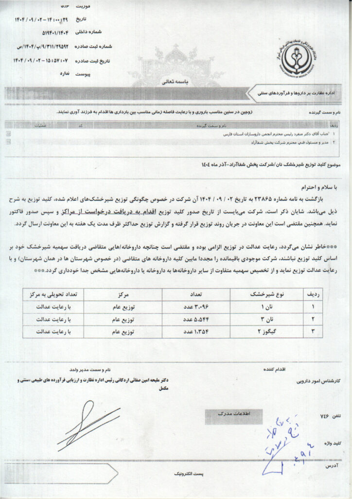 خانه>کلید توزیع دارو های کمیاب>کلید توزیع شیرخشک نان شرکت پخش شفاآراد – آذر ۱۴۰۴ کلید توزیع دارو های کمیاب کلید توزیع شیرخشک نان شرکت پخش شفاآراد – آذر ۱۴۰۴ علی رشیدی۴ آذر ۱۴۰۴ 4 کمتر از یک دقیقه واتس آپ اشتراک گذاری از طریق ایمیل چاپ علی رشیدی۴ آذر ۱۴۰۴ 4 کمتر از یک دقیقه واتس آپ اشتراک گذاری از طریق ایمیل چاپ