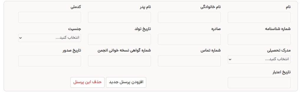 توجه فرمایید با کلیک بر روی دکمه حذف این پرسنل اطلاعات همان پرسنل بدون مشاهده اخطار حذف خواهد شد لذا در کلیک کردن و انتخاب گزینه ها دقت لازم مبذول فرمایید. لطفا اطلاعات تمام پرسنل را با افزودن پرسنل جدید اضافه نمایید. در صورت ثبت نهایی و ارسال اطلاعات ناقص، ثبت نام مجدد امکان پذیر نمی باشد.